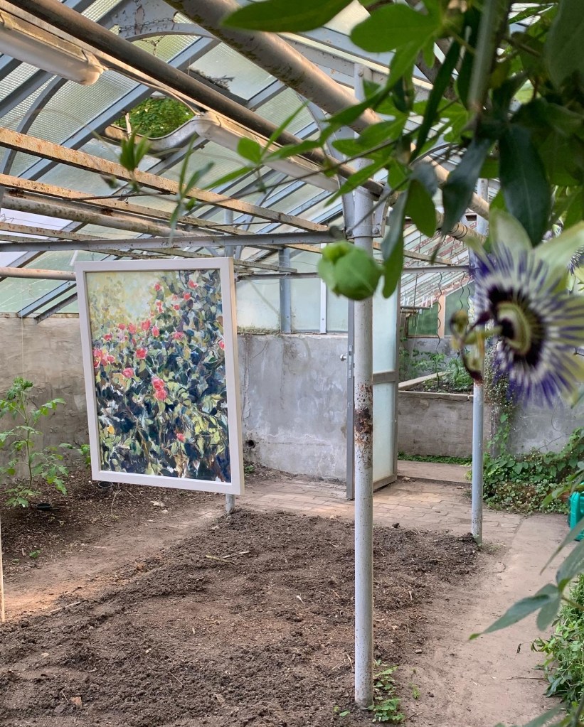 Die satten farbigen Ölbilder von Krys Robertson wirkten vor den grauen Wänden des Gewächshauses wie kleine Oasen. Ein Besucher bemerkte beim Eintreten ins erste Gewächshaus in dem ein einziges Rosenbild hing, dass es sich mit dem Rahmen aus unserer wuchernden Passionsfrucht wie ein Altarbild anfühle.